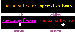Теперь мы немного углубимся и внесем изменения во внешний вид ссылок. Обычно большинство изменений касается состояния hover, но стилизовать можно и все остальные состояния. Популярным подходом является использование цвета фона для состояния hover, как показано в примере. а {color: orange;}a:link {color: orange;} a:visited {color: yellow;} a:hover {color: fuchsia; background-color: white;} a:active {color: red;} Примеры: [1] Когда указатель мыши проходит над ссылкой, цвет фона ссылки становится белым, как показано на рисунке. ![]() Можно также изменить жирность текста, сделав его полужирным, или изменить его начертание и сделать курсивом, как показано в примере a {color: orange;}a:link {color: orange;} a:visited {color: yellow;} a:hover {color: fuchsia; font-style: italic;} a:active {color: red;} Примеры: [1] Когда указатель мыши проходит над ссылкой, текст ссылки отображается курсивом, как показано на рисунке. ![]() Вероятно, самый распространенной модификацией является удаление подчеркивания ссылки. Это можно выполнить для для всех состояний, воспользоваться объявлением text-decoration: none;. a {color: orange; text-decoration: none;}Как отмечалось ранее, общие стили для всех состояний должны размещатся в якорном элементе, чтобы можно было воспользоваться наследованием. Нет необходимости добавлять это объявление ко всем псевдоселекторам, поскольку они унаследуют правело автоматически, как показано на рисунке. ![]() Правила также можно комбинировать. Некоторым дизайнерам нравится использовать подчеркивание только для состояния hover. Для этого в селектор :hover добавляется объявление text-decoration: underline;, перекрывающее унаследованное значение якорного элемента благодаря свойству специфичности селекторов. ![]() |